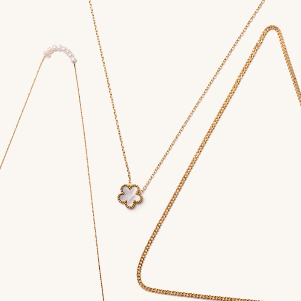 This 3-piece gold necklace layering set is the perfect balance of elegance and versatility! We love all 3 pieces of these worn alone or together! The Reagan Gold Filled Necklace is the first piece in the set. Made of 14k gold filled chain. It has as small spring clasp and is 16 inches in length. Waterproof and dainty so you never have to take it off. Next is the Nina Dainty Pearl Necklace which is a simple, yet stunning and timeless piece. Made of 14k gold plated stainless steel.